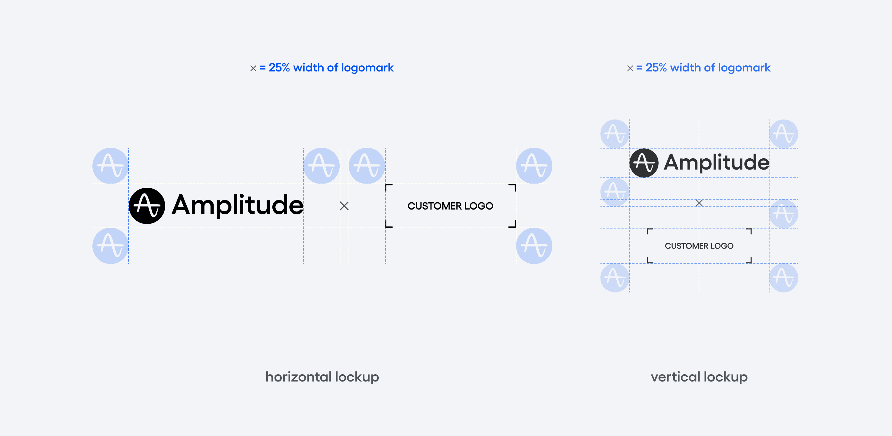 When locking up the Amplitude logo with a third-party logo, use an “X” that measures 25% of our logomark’s diameter. Whichever entity is authoring the co-branded experience should be the left-most or top-most position. Optically scale the third-party logo so that all logos feel balanced.