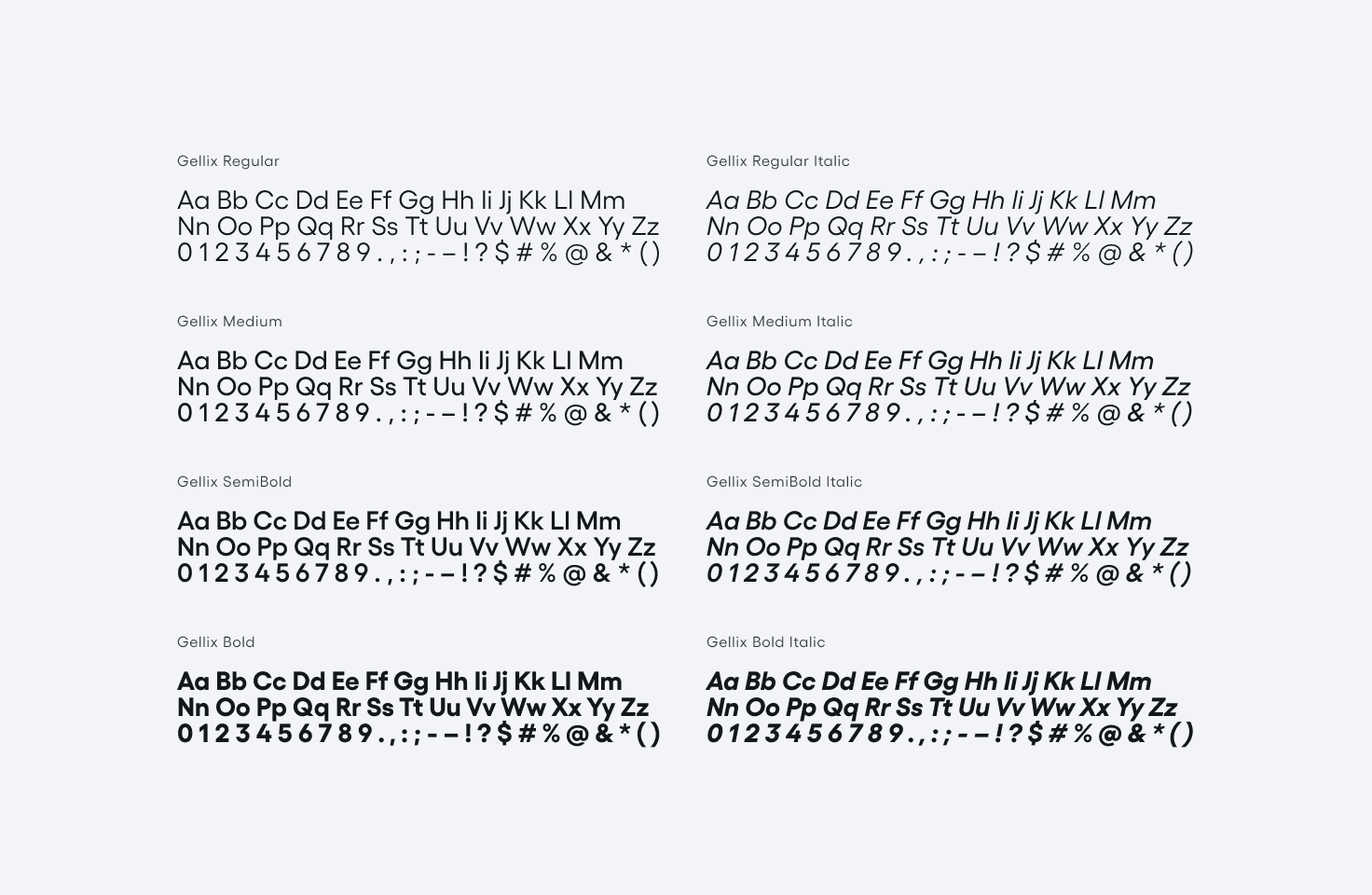 We leverage four weights from the Gellix family, in regular and italic states: Regular, Medium, SemiBold, and Bold.
