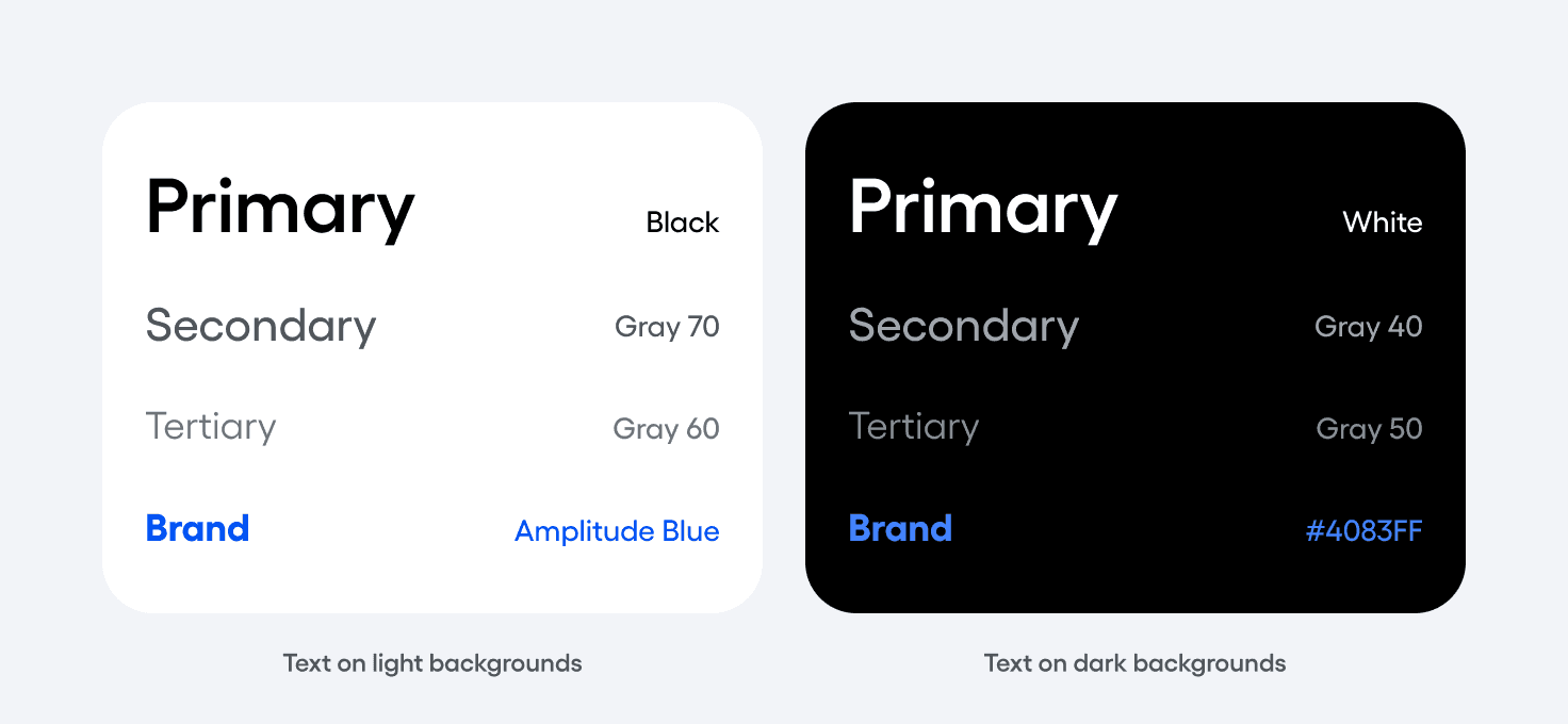 Our typography should lead in either black or white, ensuring legibility is prioritized. We use select gray values to assist in type hierarchy, as indicated below. In special instances (ie. CTA’s, links, or eyebrows), our type may be colored in Amplitude Blue. Secondary colors should never be used in typography, unless approved by brand.